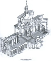 | Tempio Religioso - Vista Assonometrica con sezione longitudinale | Teatro d'Opera - Vista prospettica con sezione | |||